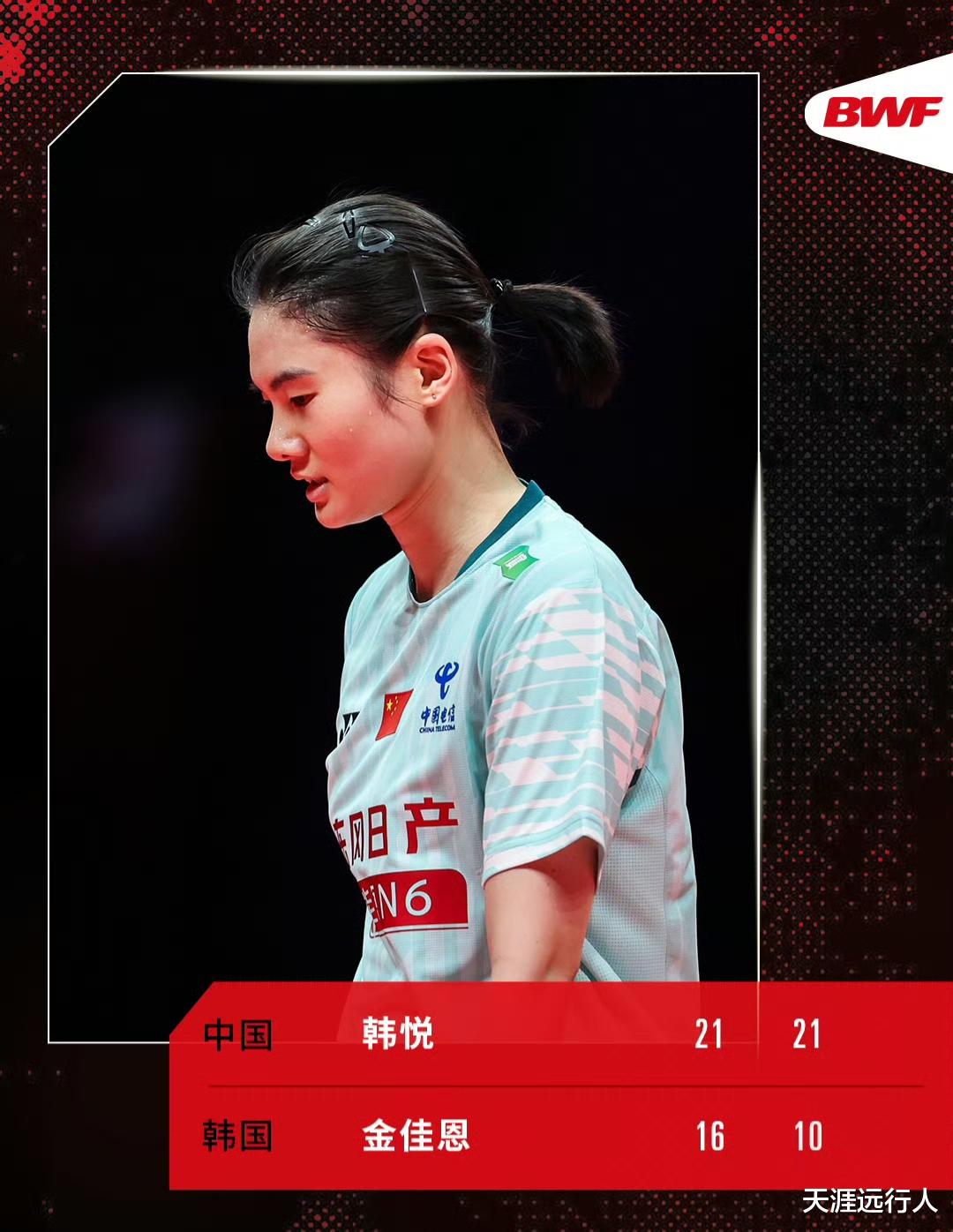国羽韩悦,以21-16, 21-10,轻取韩国球员金佳恩,晋级女单16强,收获双方交手的四连胜,把双方交手记录改写成9-3,下一轮的1/8决赛静待丹麦球员杰克斯菲德。