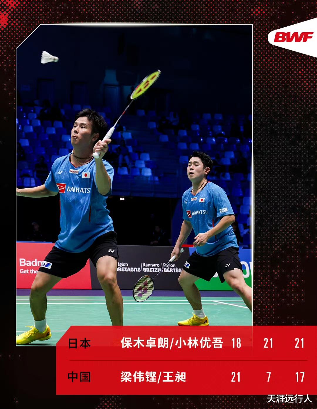 国羽一双梁伟铿/王昶,以21-18, 7-21, 17-21,遭日本小保姆组合保木卓朗/小林优吾横扫,遗憾一轮游,保木卓朗/小林优吾收获交手的两连胜,把双方的历史交手记录改写成4-5,两对组合之间的上一场交锋,也是在马来西亚,六个半月前的大马大师赛1/4决赛,梁王被对手横扫。
