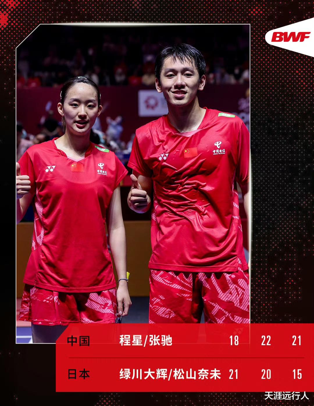 程星/张驰,以18-21, 22-20, 21-15,大战三局,强势逆转战胜日本绿川大辉/松山奈未,晋级混双16强,取得首次交手的胜利,下一轮的1/8决赛静待队友冯彦哲/黄东萍。