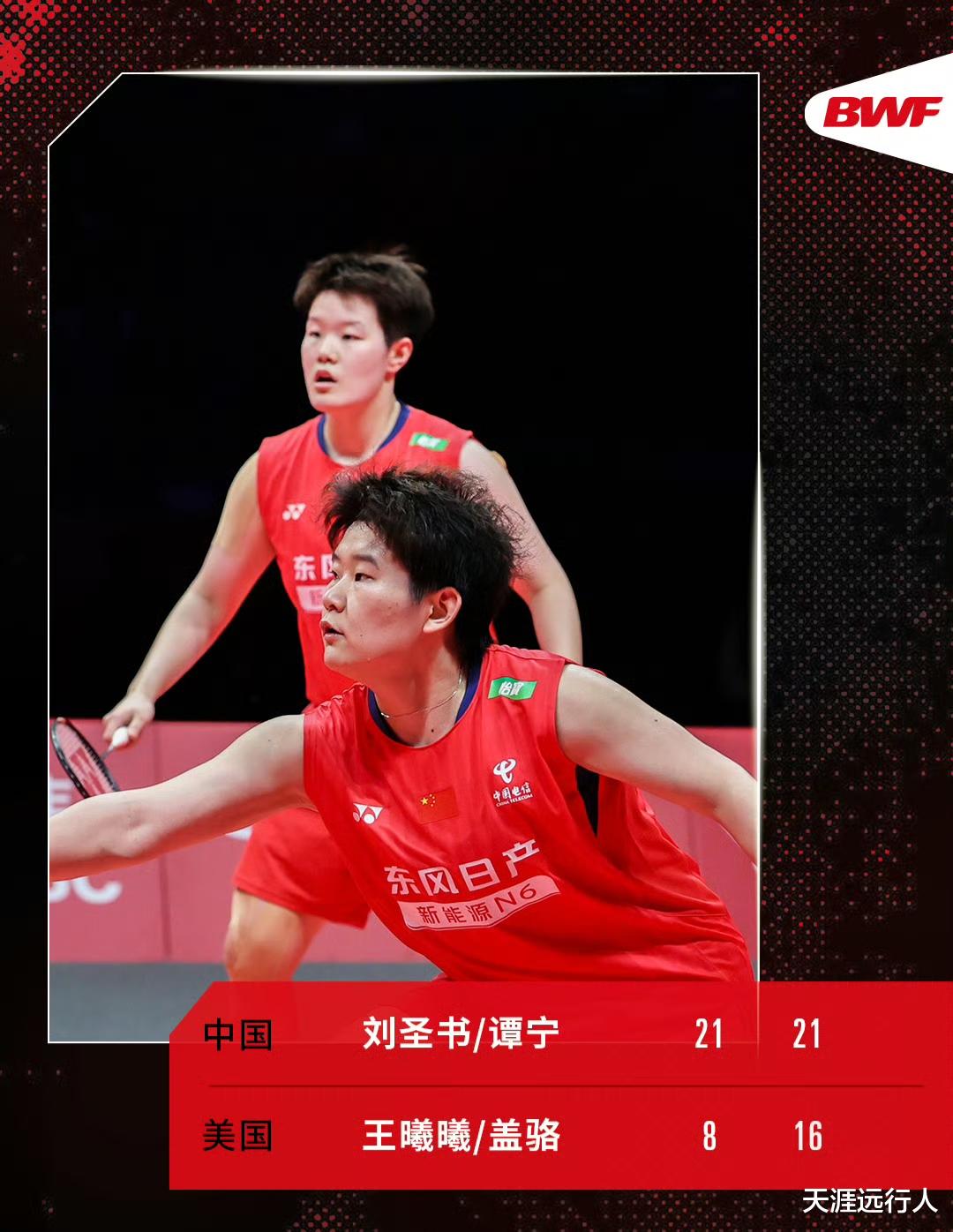 世界排名第一的刘圣书/谭宁,以21-8, 21-16完胜美国王曦曦/盖骆组合,晋级女双16强,取得双方职业生涯交手的两战全胜,下一轮将对阵日本组合保原彩夏/广上瑠依。