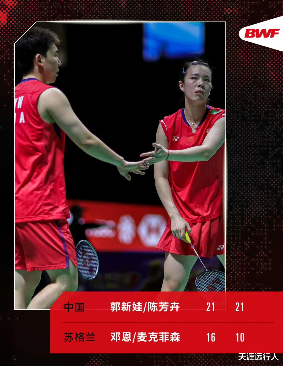国羽世界排名第六的2025全英赛冠军郭新娃/陈芳卉,以21-16, 21-10,耗时29分钟,轻松横扫苏格兰组合邓恩/麦克菲森,晋级混双16强,取得双方职业生涯两次交手的两连胜,下一场静待德国组合塞德尔/阮福芳。