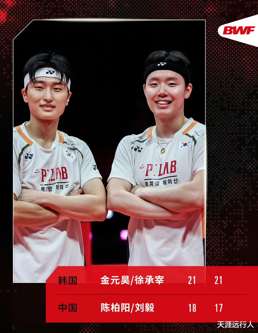 陈柏阳/刘毅以18-21, 17-21,连丢两局,不敌世界排名第一的韩国徐金组合金元浩/徐承宰,遗憾首轮出局,金元浩/徐承宰取得双方职业生涯交手的四战全胜,下一轮遭遇马来西亚组合陈蔚强/阿兹林。