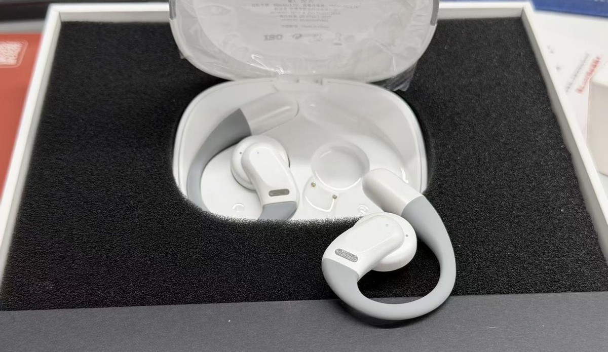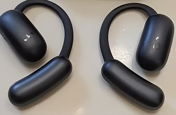 这个和其他两款的区别是比较大的,它不对准耳道,是靠着振动颅骨传声的,耳机的单元是贴在脸颊,耳挂在后脑勺。