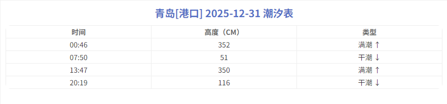 位置:青岛,日期:2025-12-31,农历:乙巳[蛇]年十一月十二,星期:星期三,潮汐类型:中潮死汛