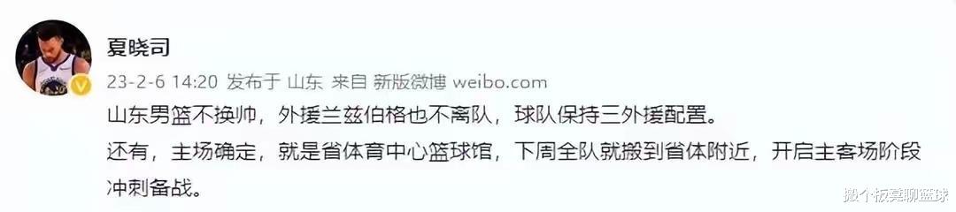 这之后,山东男篮换帅的消息就不绝于耳,有传闻山东要请回名宿巩晓彬,也有传闻球队要将丁伟扶正。不过根据山东电视台体育频道主编夏晓司透露,山东男篮不会换帅,王晗依旧担任主教练。另外球队的外援兰兹博格也不会离队,球队将使用三名外援来征战第三阶段。