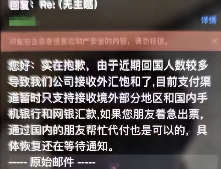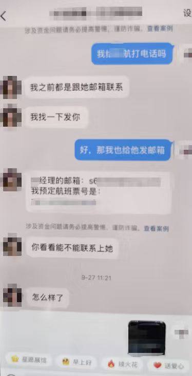 徐女士按照指示添加邮箱联系人后,“客服经理”迅速发来购票链接和银行卡账户,以“锁定机票需先付全款”为由,催促徐女士尽快转账。