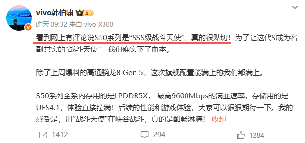 因为12月还有一个重磅嘉宾,那就是Vivo S50系列。据@VIVO韩伯啸 发文称:其内部代号为SSS级战斗天使,喜欢拍照的小伙伴们有福了。
