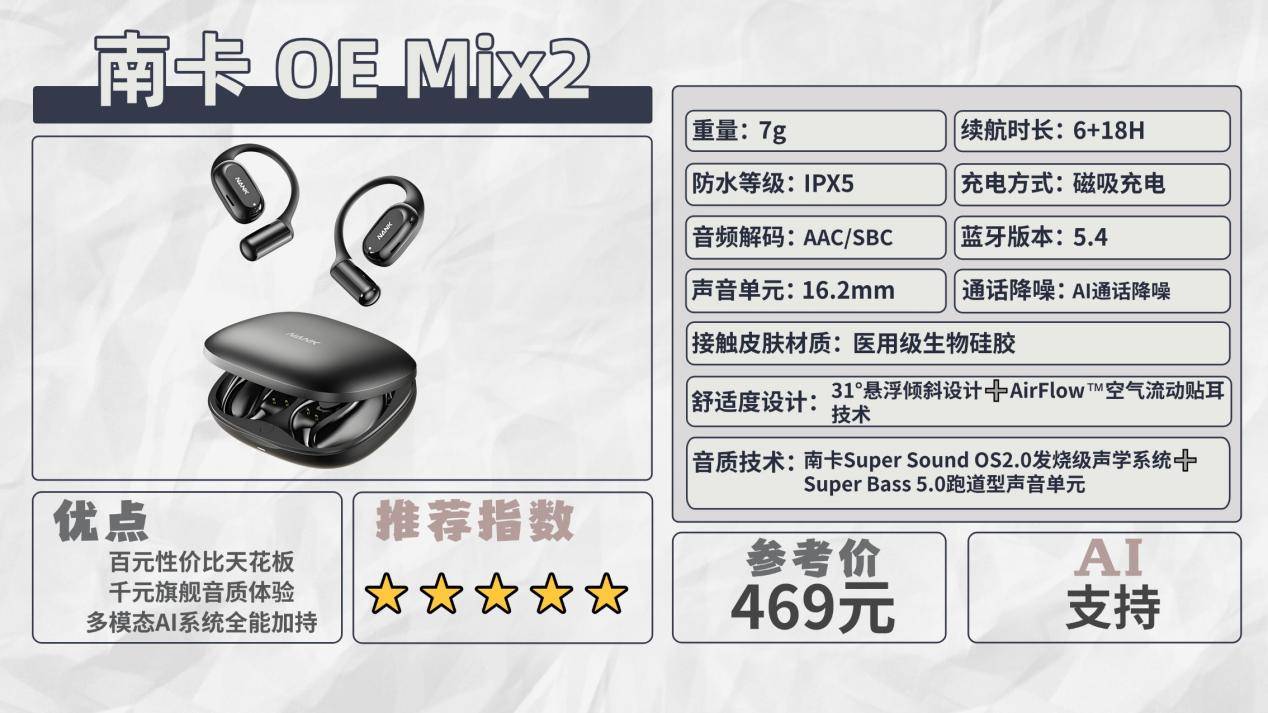 针对市面大多数开放式耳机漏音严重的问题,南卡OE Mix2采用了升级版DS 2.0指向性声学技术+创新U型声学通道结构,能够有效降低漏音情况,保护个人隐私。同时还搭载了蓝牙5.4芯片,对比以往的5.2、5.3版本,使用更加流畅,抗干扰能力更强。并且还拥有IPX5级防水能力、24小时全天续航以及AI智能功能,配置非常丰富,能够带来远超同价位竞品的高水准体验,不愧是作为百元性价比开放式耳机首选!