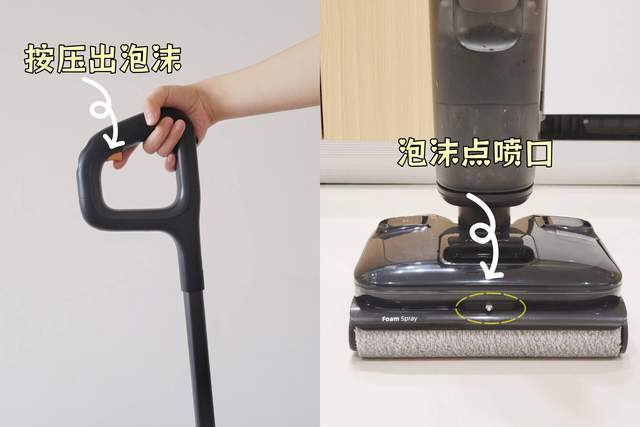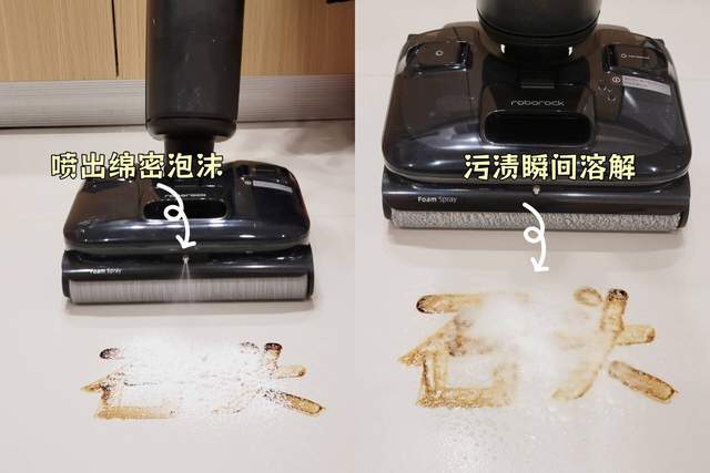 直到换了石头A30 Pro Ultra,它首创的「超微能量泡沫洗地」黑科技,直接让清洁难度降级。按压手柄内侧的泡沫点喷键,就会释放出绵密的微米级泡沫,它能迅速剥离污渍,主动分解有机物,再配合25000Pa的行业顶尖吸力以及30N超大下压力,三两下就把脏污全吸走了。