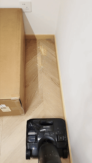 针对传统洗地机有清洁死角的问题,石头A30 Pro Ultra也有对应的法子。它采用三侧贴边设计,真正实现了三向无死角清洁,无论是墙边、家具缝隙还是狭窄的角落,只要是它能触达的地方,都能紧密贴合清理干净。从实测可以清楚地看到,婉儿撒在墙角边的小米粒和糯米粒,A30 Pro Ultra可以一遍吸拖干净,再也不用弯腰手动补擦啦~