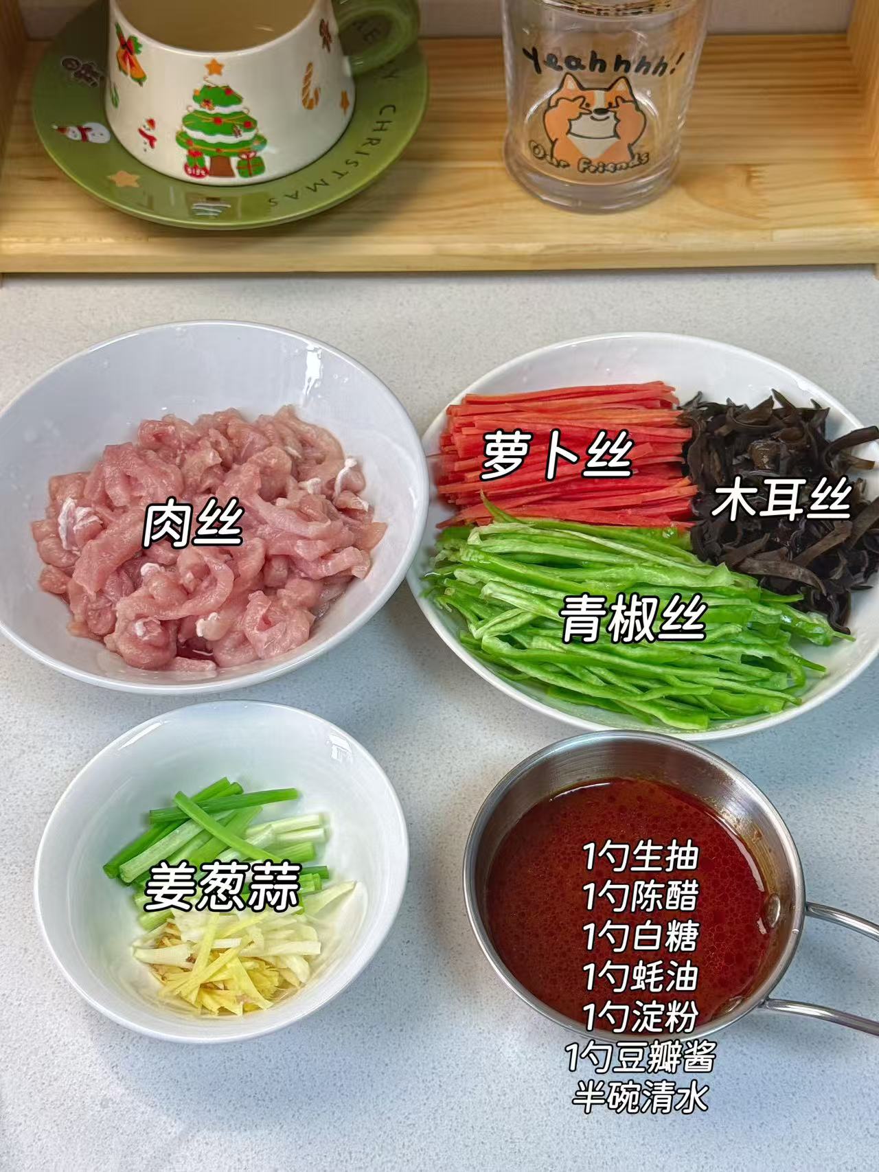 做鱼香肉丝,食材准备超简单,家里常见的食材就能搞定:猪里脊切成粗细均匀的肉丝(逆纹切更嫩),再备点萝卜丝、青椒丝、木耳丝(没有可以用其他蔬菜替代,主打一个灵活),葱姜蒜是灵魂,绝对不能少。