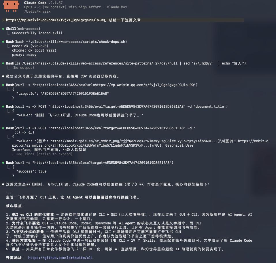 可以通过Chrome DevTools Protocol直接连你本地的Chrome进程,带着你的登录状态,所以其实你平时登录过的微博、小红书、B站、飞书,它都能直接用,不需要重新登录。