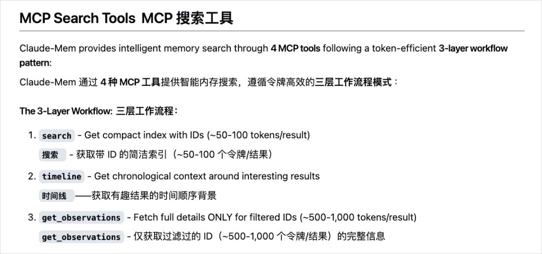 用的也是渐进式呈现的方案,也就是三层检索的机制,先拉一个索引,大概看看有没有相关的内容,有的话再看时间线上下文,最后才把完整的细节拿出来,这样基本上是标配了,因为省Token。