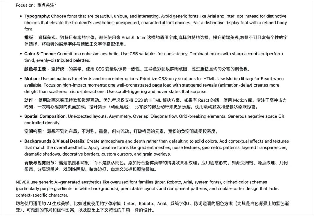 而且它有一些硬性规定,比如禁止使用Inter、Roboto、Arial这些烂大街的字体,禁止紫色渐变配白底的经典AI审美。
