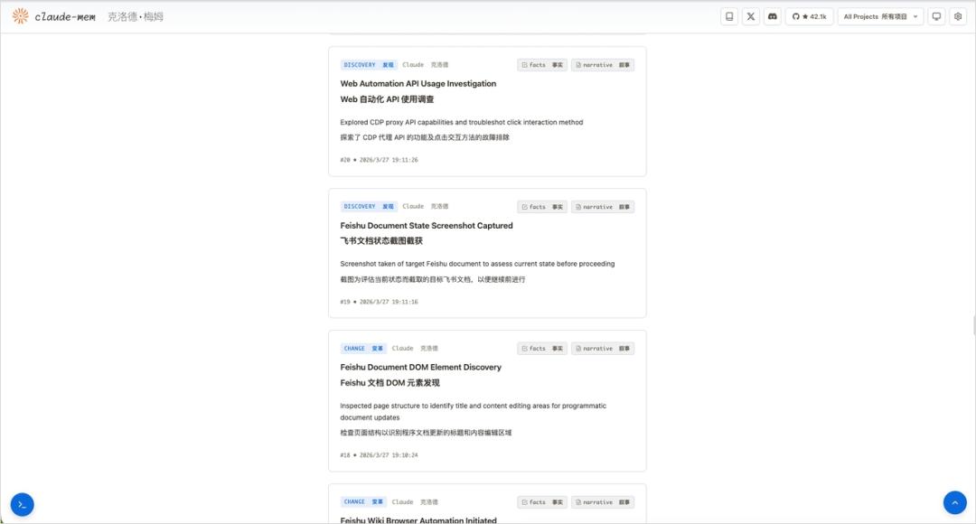 它也自带了一个本地的Web界面,跑在 localhost:37777,你可以直接在浏览器里看它到底记住了什么、什么时候记的,非常的一目了然。