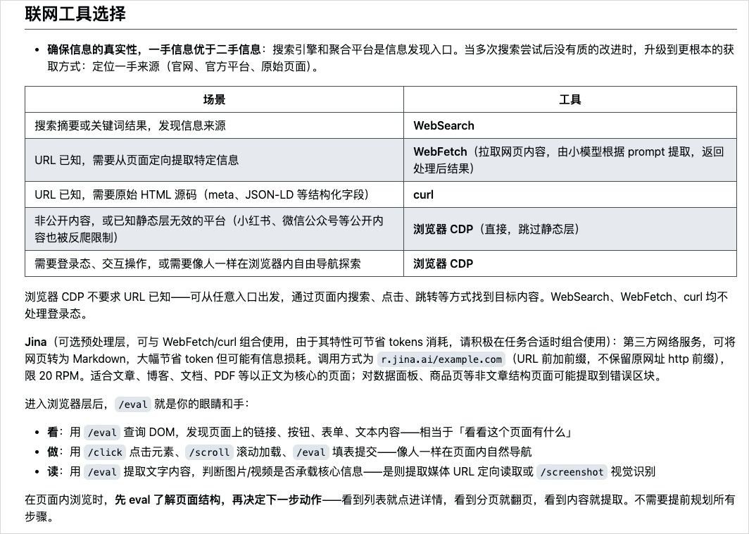 甚至贴心的出于节省token考虑,还选择了Jina作为一个可选中间层,可以和 WebFetch、Curl 组合使用,能把网页正文预先转成干净的 Markdown 再读,大幅节省 token 消耗。