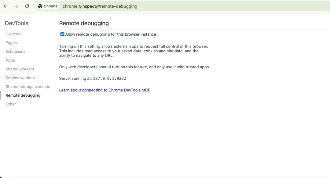 并且还需要允许远程调试,可以在地址栏输入chrome://inspect/-debugging,进行勾选。
