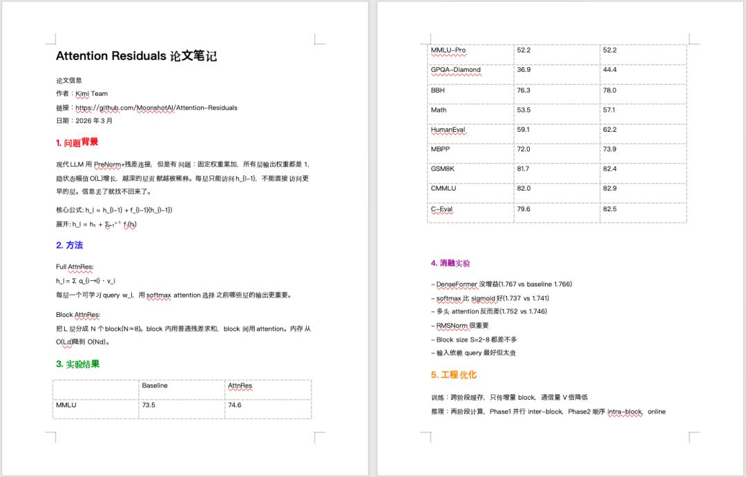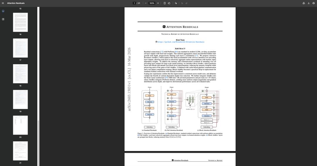 就拿Kimi最近发布的那篇比较热的论文《Attention Residuals》举个例子,21页,全英文,密密麻麻的公式和图表。