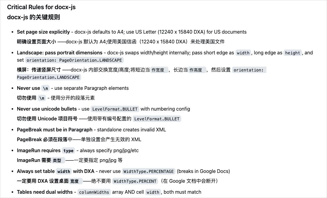 而装上了这四件套skills之后呢,里面它自带了一整套文档处理流程和代码模板。