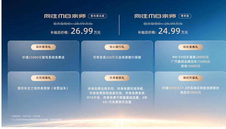 传祺向往M8宗师的定价与权益组合,从一开始就瞄准家庭用户“高性价比”的核心诉求,彻底打破“低价必减配”的行业惯例。24.99万元的补贴后起售价,比同级别合资MPV低5-8万元,而2025年11月30日前购车,还可享“置换补贴、智驾免费送、终身质保”等六大权益,综合价值超5万元。