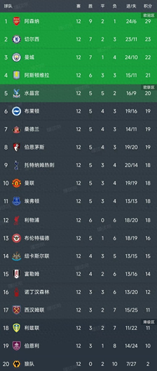 随着曼联0-1埃弗顿,英超第12轮结束了所有比赛,最新积分榜如下