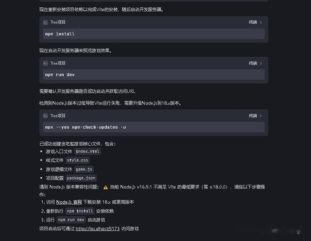 我以为Trae会使用原生纯HTML+CSS+JavaScript来帮我完成这份工作,但是实际上,Trae给我提供的解决方案是使用Vite,这本身没有什么问题,因为Trae是基于Visual Studio开发的,因此习惯上使用NPM命令,这也没什么问题,但问题就在于一个很简单的贪吃蛇游戏,在我根据引导安装了一堆依赖项以后,最后发现我电脑上的Node.Js版本与Vite要求的版本不兼容,且无法使用NPM命令更新Node.Js,最终,Trae让我手动去下载一个Node.Js版本。