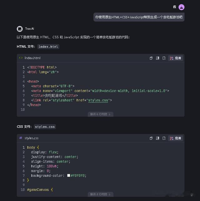 让我眼前一亮的是,Trae会根据AI给出的结果自动帮你生成对应的项目文件,我的要求是使用Web技术生成一个贪吃蛇游戏,于是Trae就给我生成了对应的HTML、CSS和JavaScript文件,这个操作的确省了很多事,对于一些没有Web前端基础,或者基础很薄弱的程序员来说,可以通过这个过程了解项目组织结构。