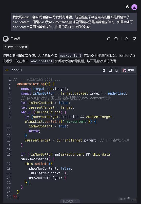 但是,就这么一个简单的要求,模型始终没有帮我解决问题,尝试了大概有一个多小时,我觉得模型给出的答案可能并不对,好在我有前端基础,我仔细看了下模型给我的代码,发现这里面有一个很简单的BUG!