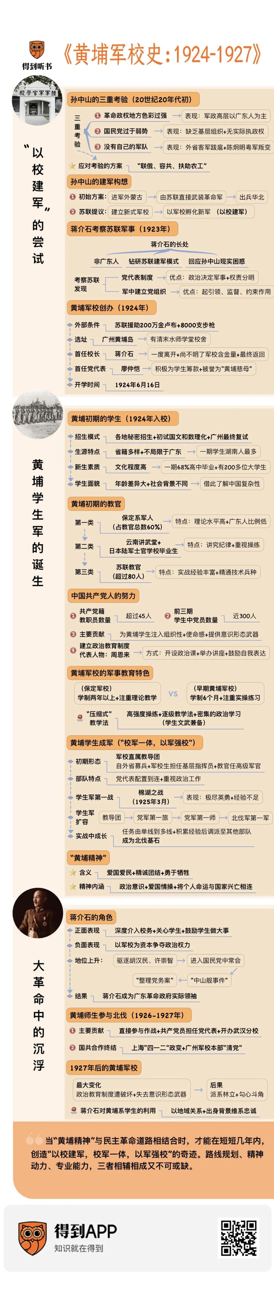 在作者曾庆榴看来,黄埔军校和近代中国的其他军事院校最大的区别,并不是它的教育水平更高,而是它将军事与政治并重,理论与实践结合,形成了“黄埔精神”这个思想基石。当“黄埔精神”与民主革命道路相结合时,才能在短短几年内,创造“以校建军,校军一体,以军强校”的奇迹。路线规划、精神动力、专业能力,三者相辅相成又不可或缺。改写中国历史的,不仅是这所学校本身,更是它背后的思想和精神能量。