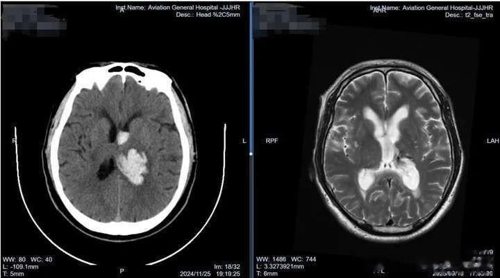 患者田某,于2024年11月25日下午4时无明显诱因突然摔倒在地,右侧肢体活动不利,小便失禁。120急救车送往北京航空总医院后,头颅CT检查提示:左侧丘脑出血,破入脑室。