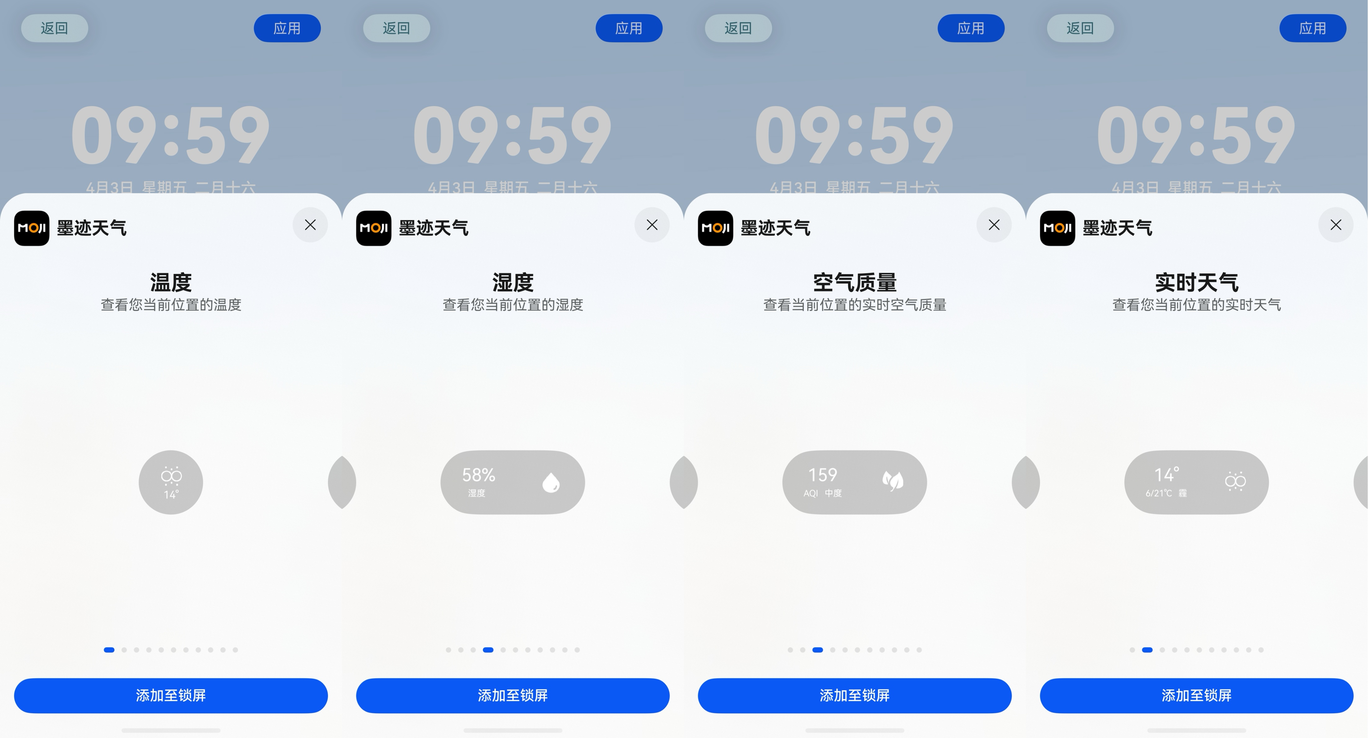 设置方法也超级简单:在锁屏界面双指捏合、解锁手机,找到墨迹天气,即可随心添加天气锁屏卡片。