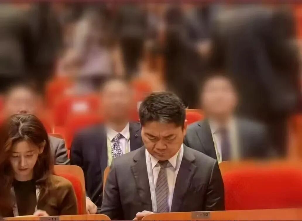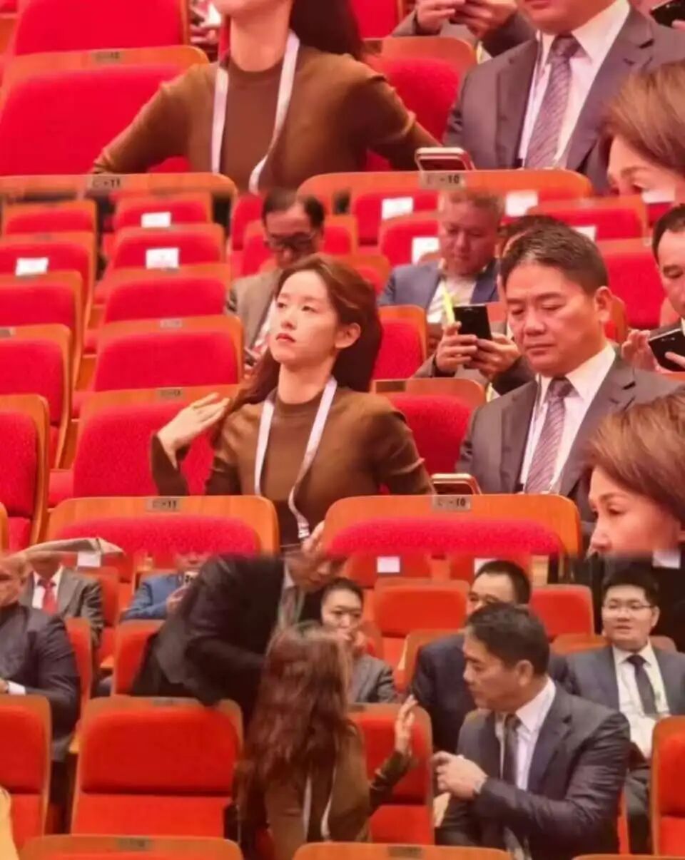 第一张,东哥头发有点花白了,皱着个眉头,埋头戳手机,表情严肃得像在开会。而旁边的章泽天,脖子挺得直直的,下巴微扬,眼神那坚定地看着前面。