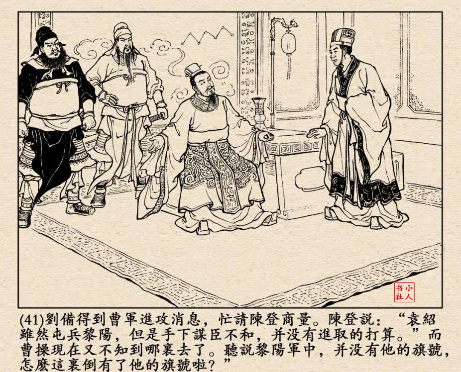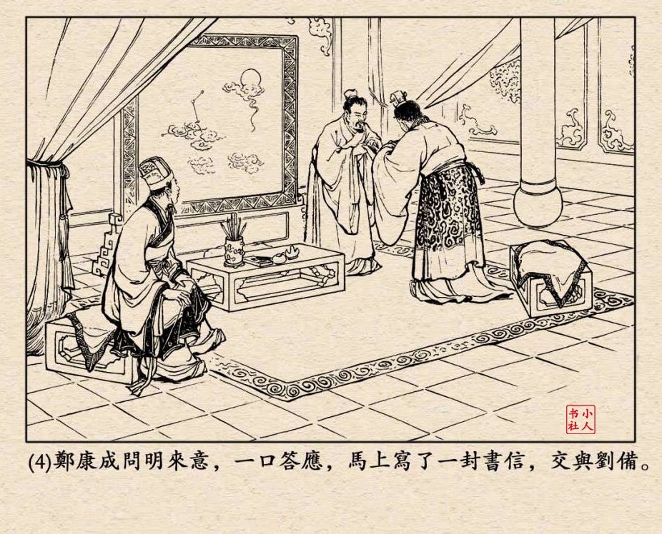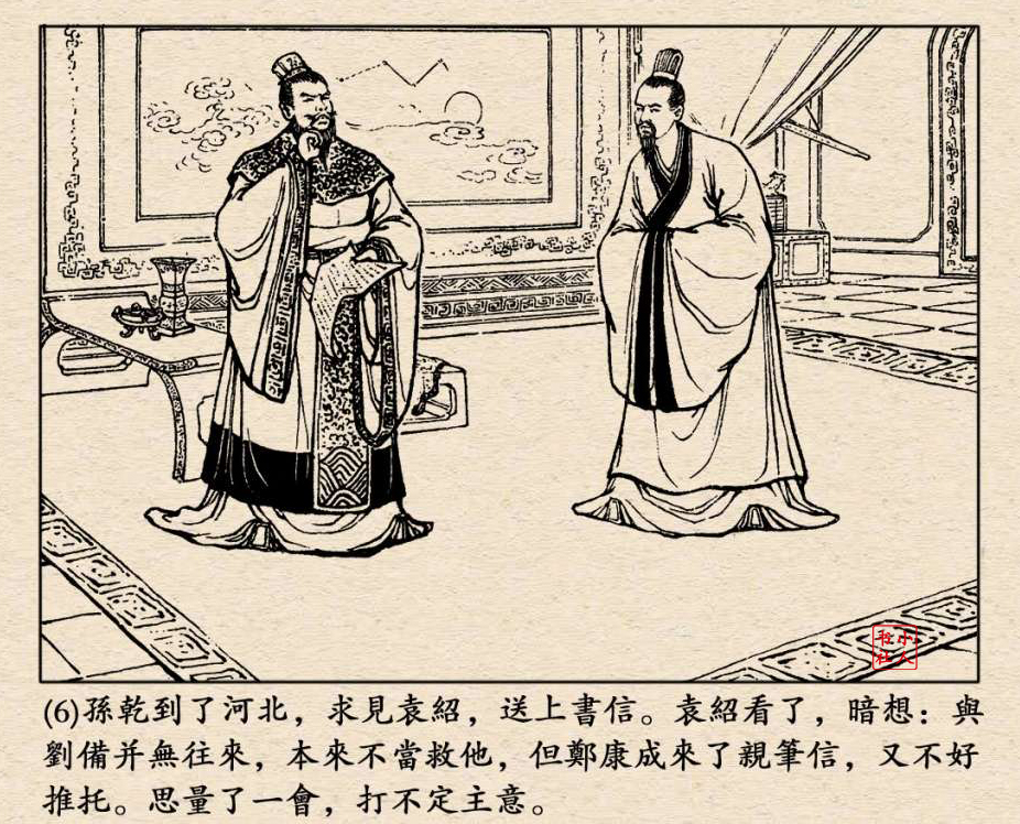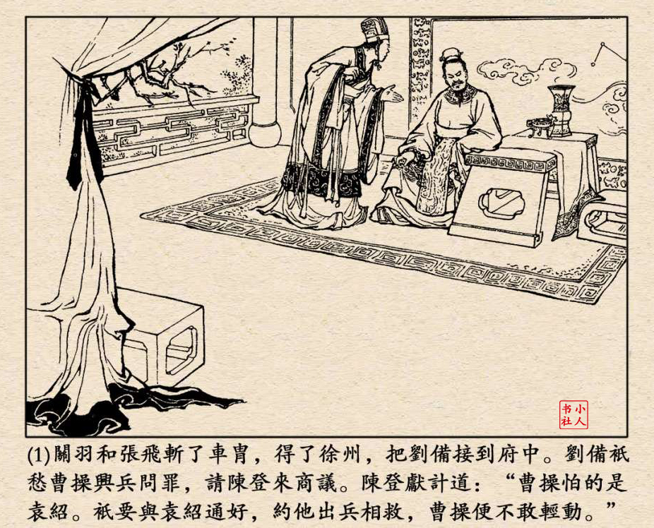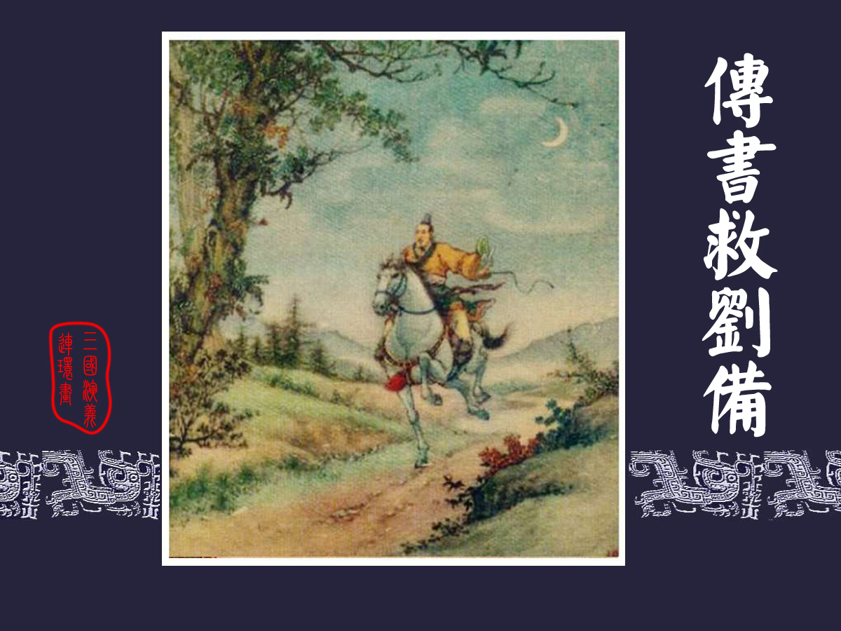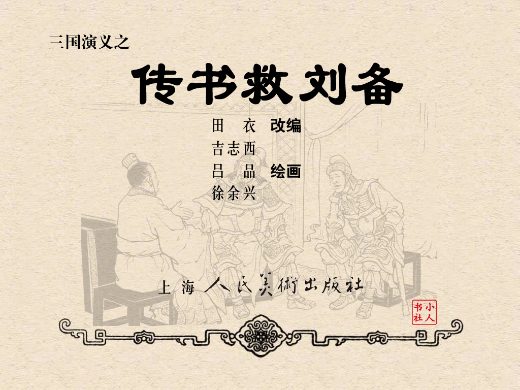《传书救刘备》连环画是由田衣、吉志西改编,吕品、徐余兴绘画。故事讲述刘备担心曹操问罪,求郑玄写了书信,请袁绍出兵相救。袁军到达,内部意见不一,按兵不动,与曹军相持不战。曹操乘机分兵攻徐州。关、张出兵应战,击破曹军。