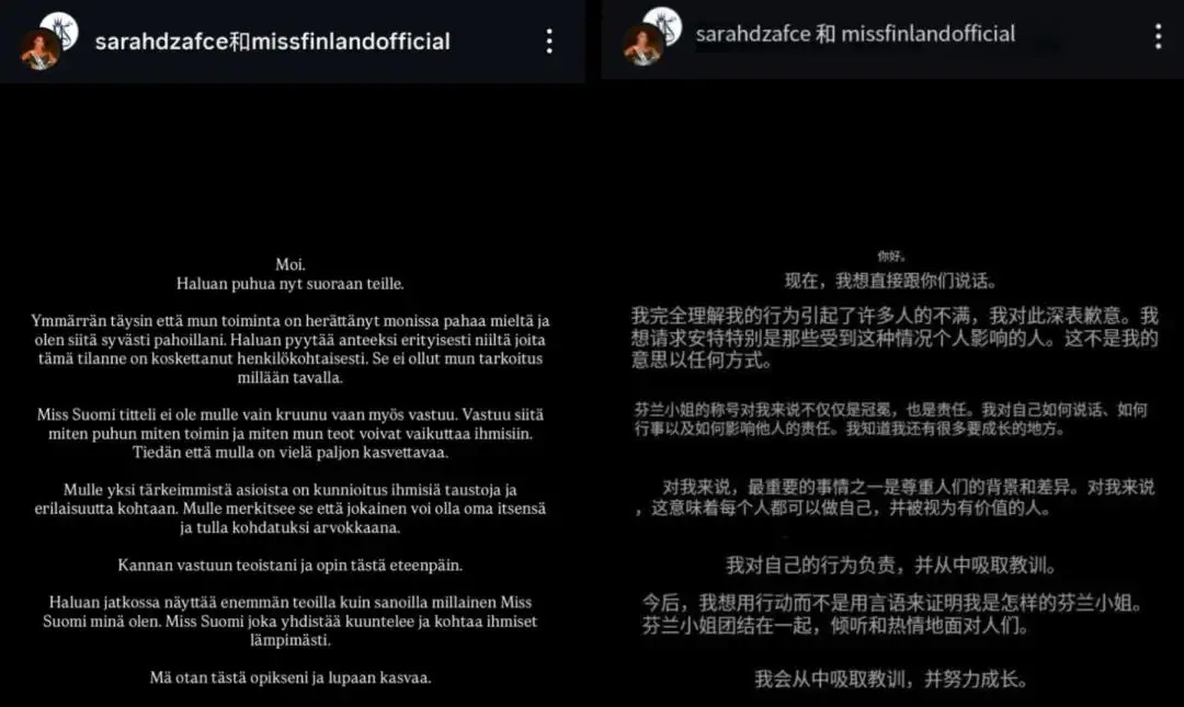 眼看舆论失控,Sarah与芬兰小姐主办方联合发布“道歉声明”,但全文避重就轻,既不承认种族歧视,也不道歉撒谎行为,仅用“文化差异”“无心之举”轻飘飘带过,还多次强调“自己配得上冠军头衔”。