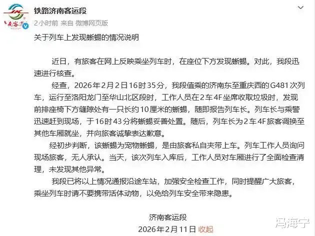 近日,有旅客在网上反映乘坐列车时,在座位下方发现蜥蜴。对此,济南客运段迅速进行核查。2月11日,济南客运段在其官方微博发布关于列车上发现蜥蜴的情况说明:系旅客私自夹带上车。