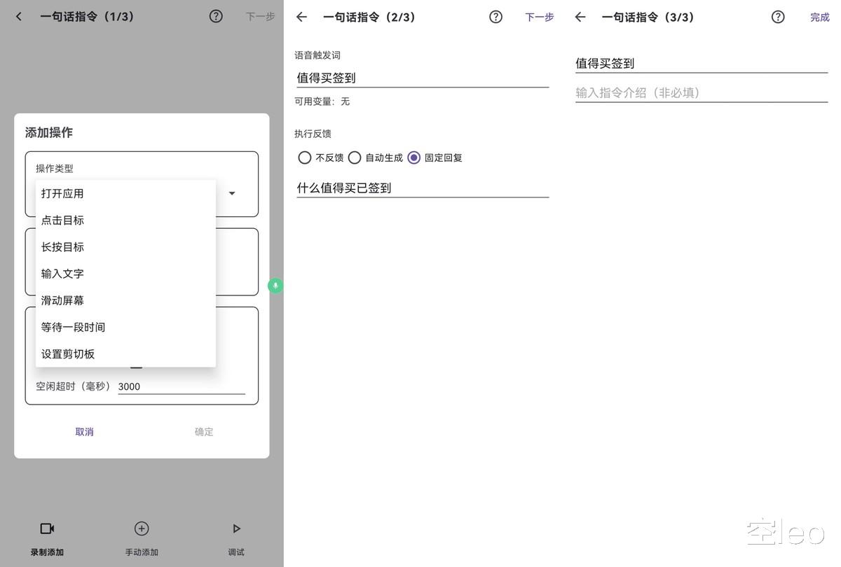 小白友好层:通过“动作录制”功能,用户可以教手机自动完成操作流程,系统自动生成语音指令。例如“淘宝签到”只需录制一次点击路径,后续语音即可触发。