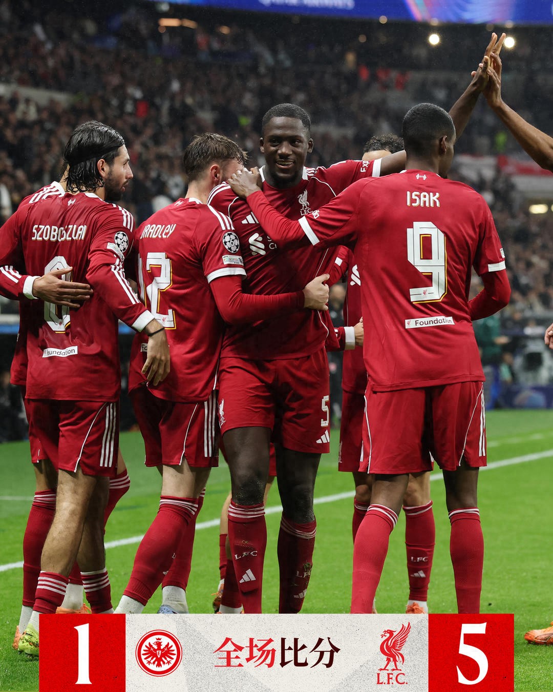 欧冠联赛阶段第3轮一场焦点战,由法兰克福主场迎战利物浦。最终,利物浦依靠埃基蒂克、范戴克、科纳特、加克波、索博斯洛伊的联袂破门,以5-1客场逆转法兰克福,终结各项赛事4连败战绩。