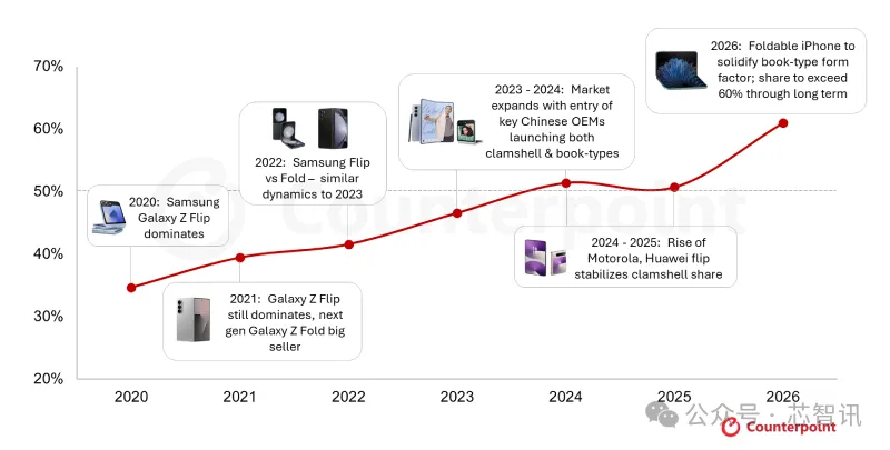 在折叠屏形态方面,CounterPoint Research指出,折叠屏手机的形态偏好正经历关键转折,左右折叠(Book-type,书本式折叠)设计将在2026年进一步巩固其主导地位。