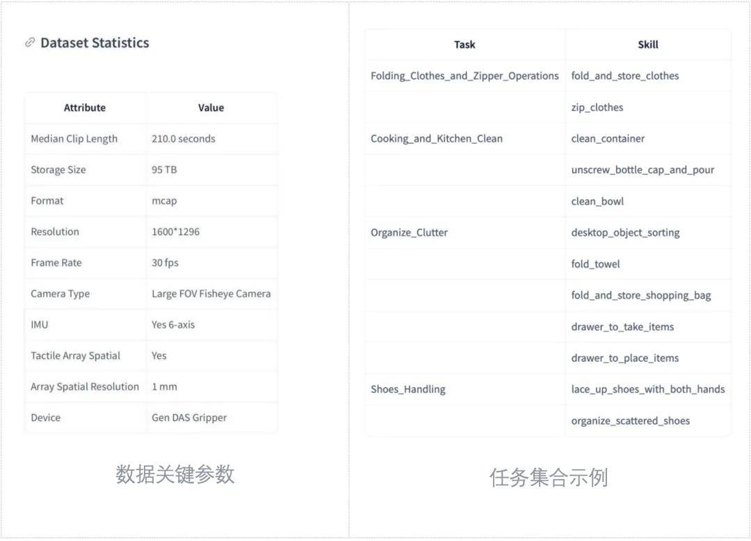 而在技能方面,单手在实际场景中可以完成的任务优先,因此难得是在数据集中,99.2% 都是 “双手、长程任务”,这也让它变得更落地 —— 以第一批数据为例,平均 clips 长度为 1min37s。这意味着,它记录的不是一张张静态快照,而是从 “拿起散乱 T 恤” 到 “叠放整齐” 的完整过程,是动作逻辑与因果的连续学习。