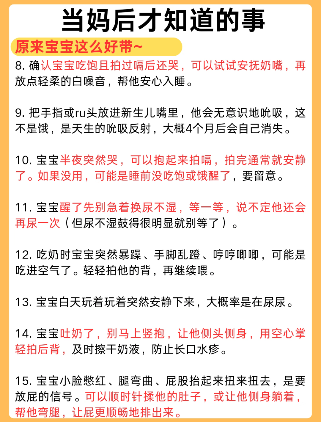 你抱着他的时候,他会把小脑袋往你怀里拱,使劲往里钻,好像想重新回到你身体里一样。我家宝宝每次困了,就把脸埋在我脖子里蹭来蹭去,闻着我身上的味道,蹭着蹭着就睡着了。有时候我把他放床上,他睡一会儿醒了,不哭也不闹,就睁着眼睛四处看。等我凑过去看他,他一看到我的脸,立马就笑了,小手小脚一起挥舞,像在说“你来了你来了”。