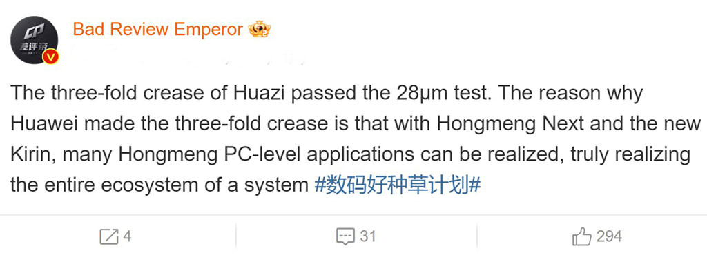 数码博主差评帝通过微博享了关于即将推出的三折叠手机的新消息:“华子的三折折痕通过了28um的测试。华为之所以做出三折折痕,是因为有了鸿蒙Next和新麒麟,可以实现很多鸿蒙pc级的应用,真正实现整个系统的生态。”