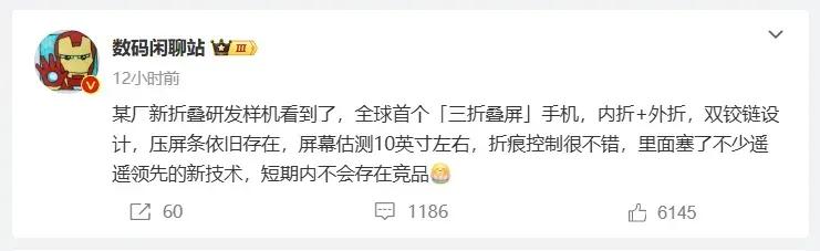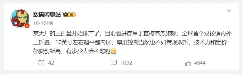根据博主数码闲聊站的三折叠手机的新消息:“某大厂的三折叠开始排产了,目前看进度早于直板商务旗舰;全球首个双铰链内外三折叠,10英寸左右超平整内屏,厚度控制当然也不如常规双折,技术力和定价都要创新高,有多少人会考虑呢”