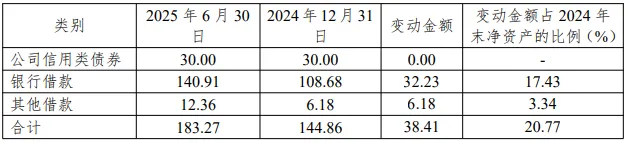 截至2025年6月末,烟台业达城发借款余额已达183.27亿元,较2024年末的144.86亿元,半年时间猛增38.41亿元,占上年末净资产的20.77%。拆分来看,32.23亿元来自银行借款,6.18亿元为其他借款。