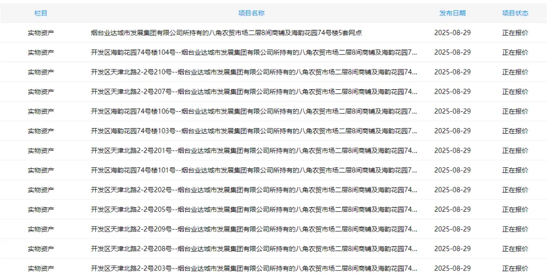 2025年8月29日,山东产权交易中心的一则挂牌信息显示,烟台业达城发转让八角农贸市场8间商铺、海韵花园5套网点,报价从88万元到800余万元不等。此前,公司已挂牌转让开发区晨光、旭日等小区的98套住宅及部分沿街商铺。