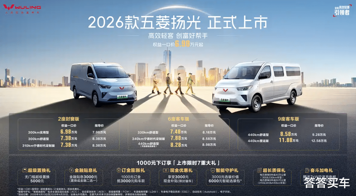 4月13日,上汽通用五菱旗下微面车型——2026款五菱扬光正式上市,8款车型的售价在7.98万-12.58万元之间,权益后一口价6.98万起。即日起购车,可享无门槛超级置换5000元或金融贴息3000元、支付1000元订金可抵扣3000元购车款、至高3000元现金补贴(部分车型)、赠送7kW交流充电桩(指定车型)多重好礼。详细售价及权益请见下图: