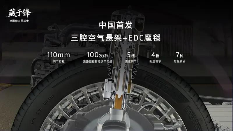 这次技术升级的一个核心是底盘。岚图泰山全系标配了“中国首发”的三腔空气悬架,并且搭配了EDC魔毯功能。简单理解,三腔空气悬架比普通的单腔或双腔能提供更多档位的刚度和高度调节,好处是既能保证过弯时车身的稳定性,又能更好地过滤掉路面的颠簸,试图解决大车“开起来像船”的痛点。EDC魔毯则可以理解为一种更智能的减震系统,能根据路面情况快速调整阻尼。再加上它还有双向16度的后轮转向系统,官方表示这台大车的转弯半径可以小到5.4米,在城里开、窄路调头会灵活不少。