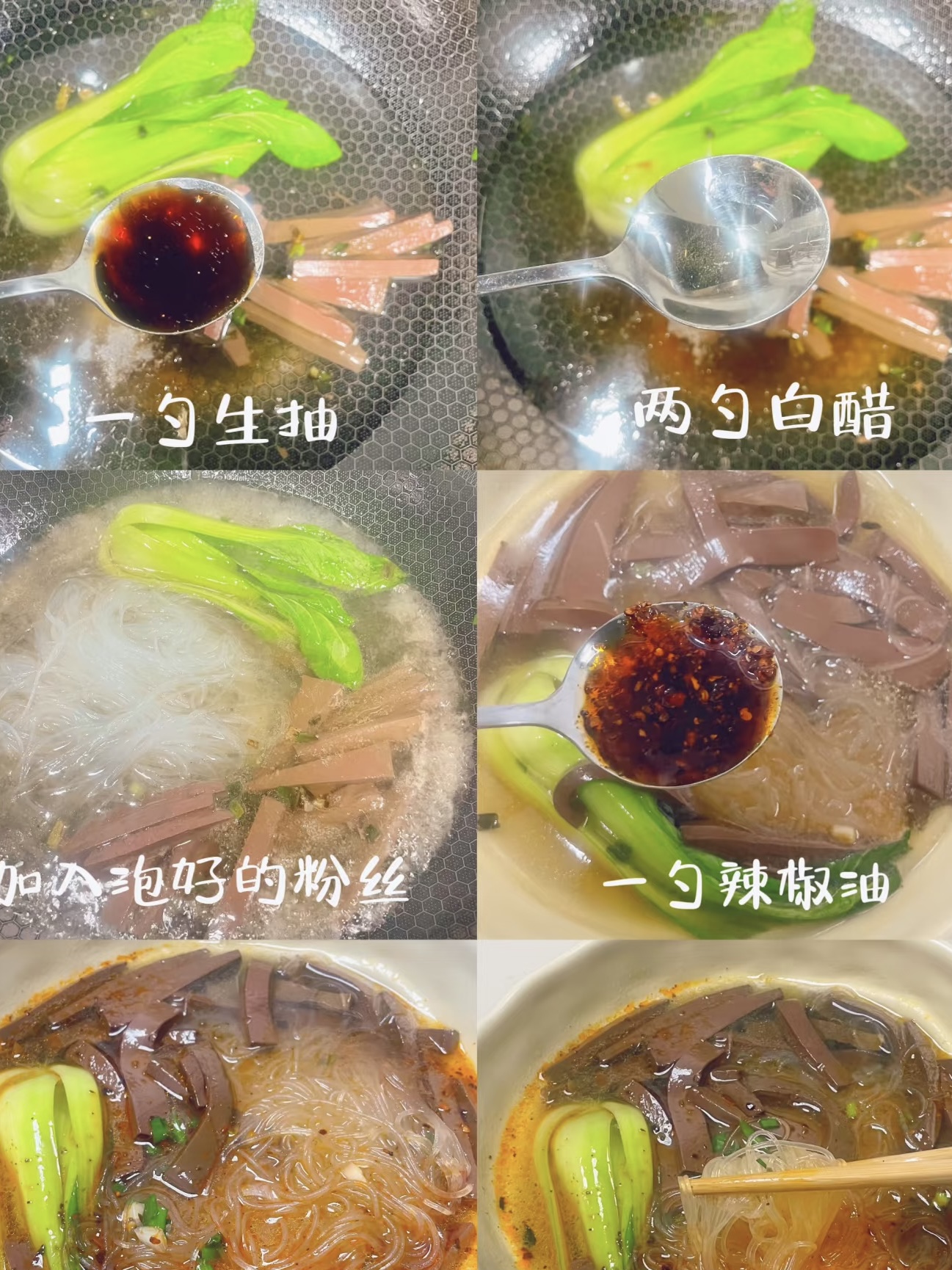 端起碗来先喝一口汤,酸辣鲜香,层次丰富,从舌尖一直暖到胃里。再夹一筷子粉丝,吸溜一口,滑溜溜地钻进喉咙。鸭血嫩得像豆腐,却带着独特的韧性,青菜脆生生的解腻又爽口。这一碗下肚,什么烦恼都抛到九霄云外去了,难怪古人说"一碗解千愁"呢!