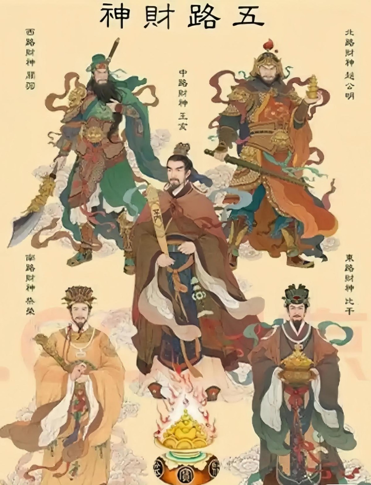 值得一提的是,“五路财神” 存在三种组合:小五路财神由武财神赵公明及其手下招宝天尊萧升、纳珍天尊曹宝、招财使者陈九公、利市仙官姚少司组成;大五路财神分别为东路财神比干、南路财神柴荣、西路财神关公、北路财神赵公明、中路财神王亥;还有五色财神,即白财神、黄财神、红财神、绿财神、黑财神,这三种组合共同构建起丰富的“五路财神”体系。