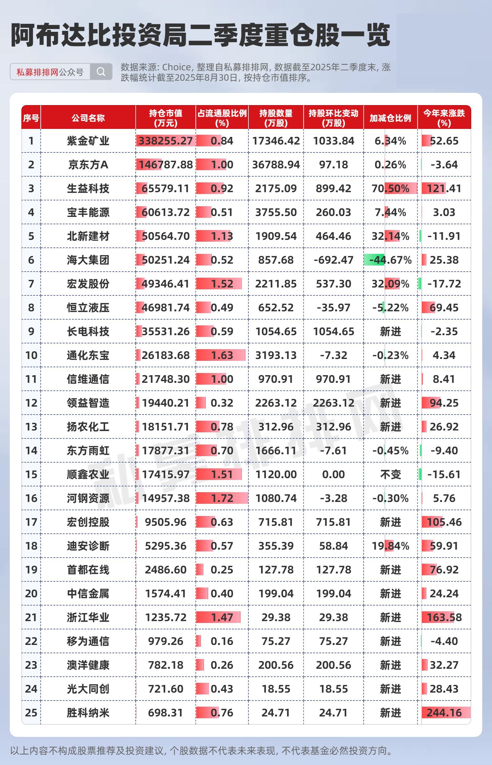 截至二季度末,阿布达比投资局位列A股25家上市公司的前十大流通股东名单,所持股今年以来涨幅均值为43.26%,合计持有市值约为100.03亿元。从持股变动来看,阿布达比投资局二季度新进12家公司、加仓7家公司、减仓5家公司。
