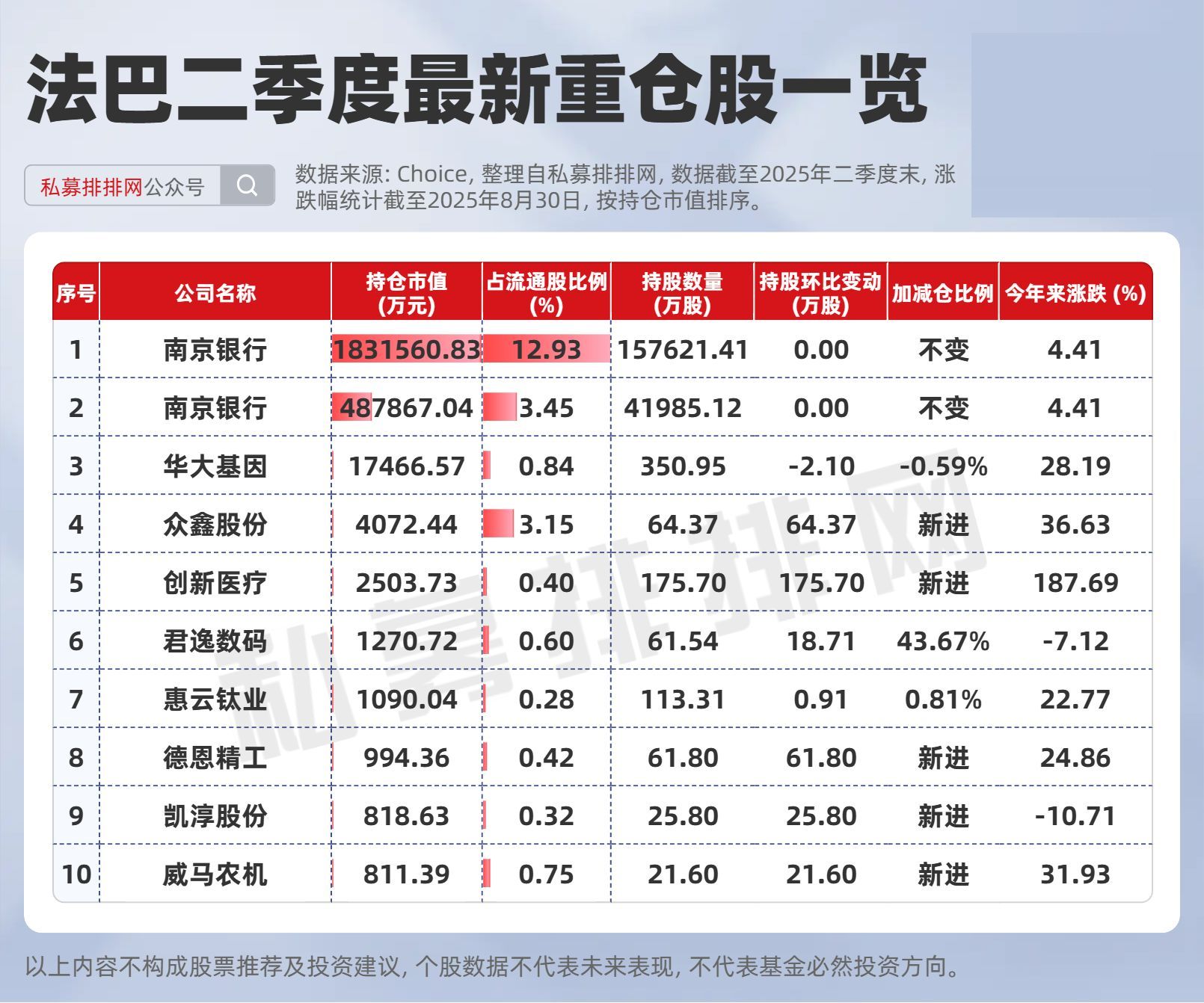 截至二季度末,法巴共重仓持有10家A股公司,今年来的涨幅均值为32.31%,持有市值合计为234.85亿元,而2024年底为198.61亿元。法巴通过QFII持有流通市值最高的是南京银行,二季度合计持有公司19.96亿股,持有市值约为231.94亿元。